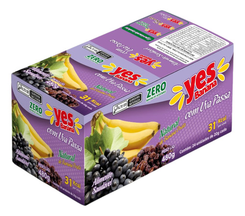 Ingredientes: Banana prata, uva passa, acidulante ácido cítrico, conservante sorbato de potássio. Display com 24 unidades de 20 g, 34 kcal por unidade Zero adição de açúcares, fonte de minerais e fibras, 100% fruta in natura, sem colesterol, produzido com banana prata.