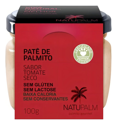Patê de Palmito Sabor Tomate Seco 100g Patê de palmito de palmeira real, com sabor inigualável, adicionado do delicado toque do tomate seco. Produto vegano, de baixa caloria, ideal para servir em canapés, recheios, brusquetas, e tornar o lanche da família ainda mais gostoso. Ingredientes: palmito palmeira real, água, tomate seco, fécula de mandioca, óleo vegetal, sal, condimentos, acidulante ácido cítrico (INS 330) e ácido ascórbico. Não contém glúten.